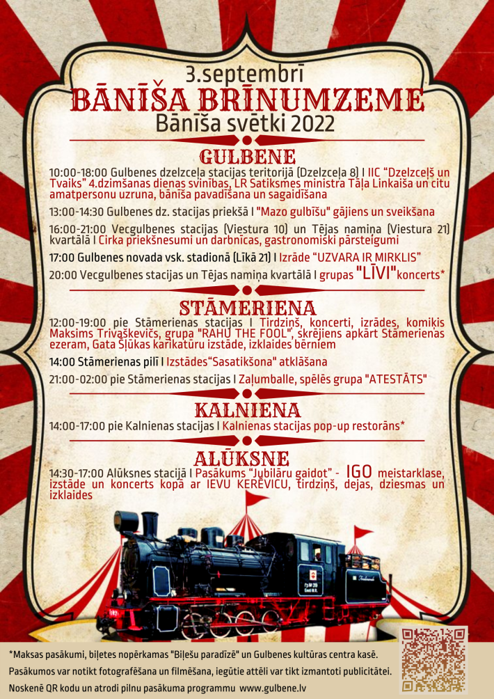 12:30-13:00 bānīša kopīga pavadīšana ar “Di-dancers” dejotājiem (Balvi), burbuļu baloniem un mīmiem. Ar tvaika lokomotīvi “Ferdinands” priekšgalā bānītis 13:00 dosies ceļā uz Alūksni. Bez maksas.