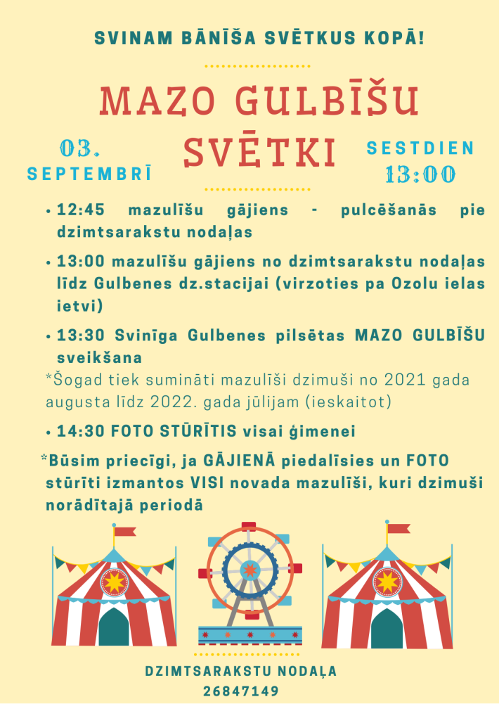 13:30 Svinīga Gulbenes pilsētas mazo Gulbīšu sveikšana (dzimuši no 2021.gada augusta līdz 2022.gada jūlijam)