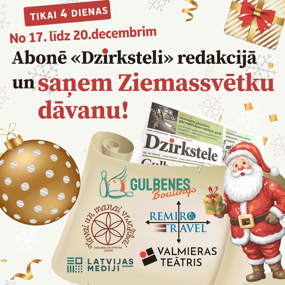 No 17. līdz 20.decembrim abonē “Dzirksteli” vismaz 2 mēnešiem redakcijā vai pa e-pastu “abone@dzirkstele.lv”, vai pa tālruni 26136786 un izvēlies Ziemassvētku dāvanu no “Latvijas Medijiem”, “Remiro Travel”, “Gulbenes Boulinga”, “Valmieras teātra” vai “Tavai un manai veselībai”. Dāvanu skaits ir ierobežots!