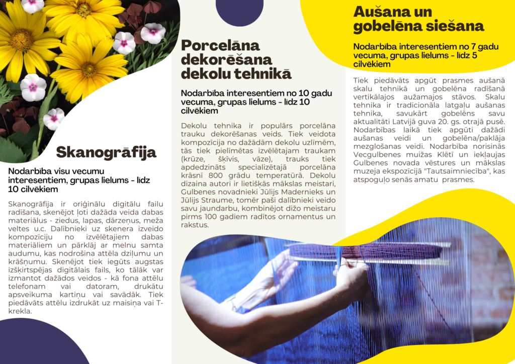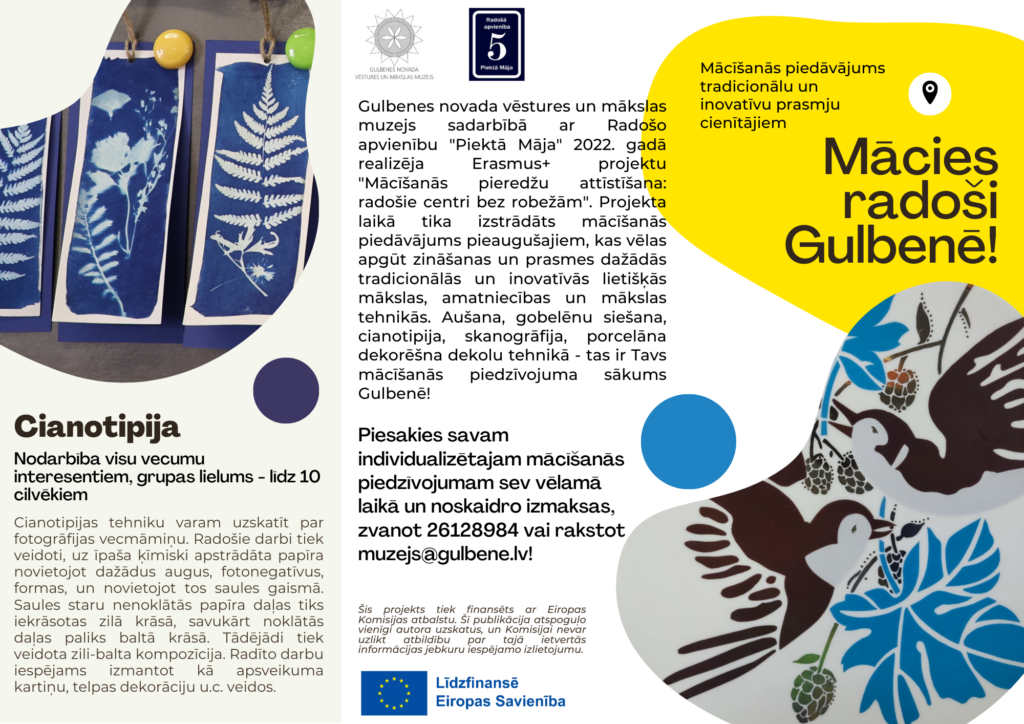 Februārī noslēdzās gadu ilgušais “Erasmus+” projekts “Mācīšanās pieredžu attīstīšana: radošie centri bez robežām”, kura ietvaros sadarbībā ar Gulbenes biedrību “Radošā apvienība “Piektā Māja”” ir izstrādāts mācību piedāvājums pieaugušajiem (un ne tikai) dažādu radošu prasmju apgūšanai. Pieteikt mācīšanos sev vēlamā laikā un noskaidrot izmaksas ir iespējams, zvanot pa tālruni 26128984 vai rakstot uz e-pastu “muzejs@gulbene.lv”.