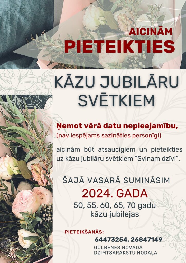 Ņemot vērā datu nepieejamību, nav iespējams sazināties personīgi, līdz ar to Dzimtsarakstu nodaļa aicina būt atsaucīgiem un pieteikties kāzu jubilāru svētkiem “Svinam dzīvi!”, zvanot pa tālruni 64473254 vai 26847149 (Gulbenes novada Dzimtsarakstu nodaļa).