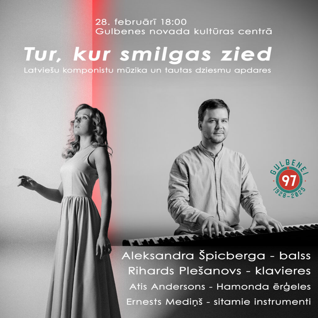 28. februārī pulksten 18.00 Gulbenes novada kultūras centrā notiks Gulbenes pilsētas 97. jubilejas svētku koncerts “Tur, kur smilgas zied”, uz kuru aicina dziedātāja Aleksandra Špicberga un novadnieks pianists Rihards Plešanovs.