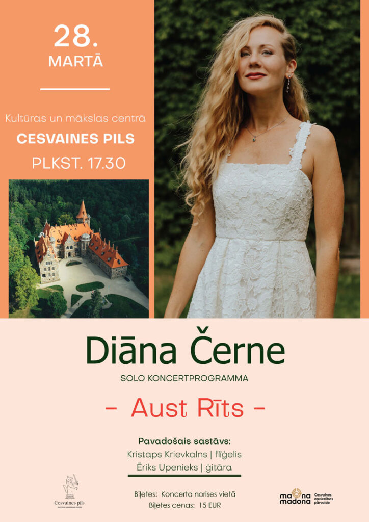 Jau šā gada 28. marta pievakarē plkst. 17:30 mūziķe un grāmatas autore Diāna Černe dziedās saviem klausītājiem iedvesmojošo koncertprogrammu “Aust rīts” skaistajā Cesvaines pilī, kura arī dziedātāju nav atstājusi vienaldzīgu.
