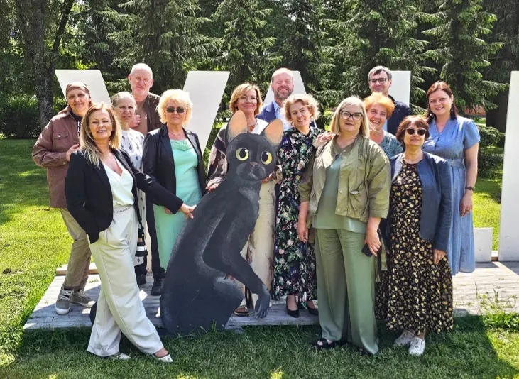 PASPĒJĀM Valkā nofotografēties ar prestižās latviešu animācijas filmas “Straume” galvenā personāža – kaķa – tēlu. Attēlā dzirkstelieši kopā ar “Ziemeļlatvijas” un citu reģionālo laikrakstu kolēģiem. Bija arī iespēja kultūras centrā redzēt “Straumei” piešķirtās balvas – “Zelta globusu” un “Oskaru”. FOTO: LĪGA ORLEANA