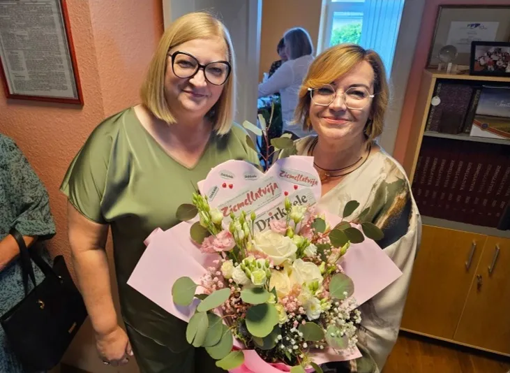 AR ZĪMĪGU PUĶU PUŠĶI, kuru veidojusi gulbeniete floriste Inese Baumane, sveicienu no “Dzirksteles” kolektīva un mūsu lasītājiem galvenā redaktore Ginta Alberte pasniedza laikraksta “Ziemeļlatvija” galvenajai redaktorei Ingūnai Johansonei (no labās). FOTO: LĪGA ORLEANA