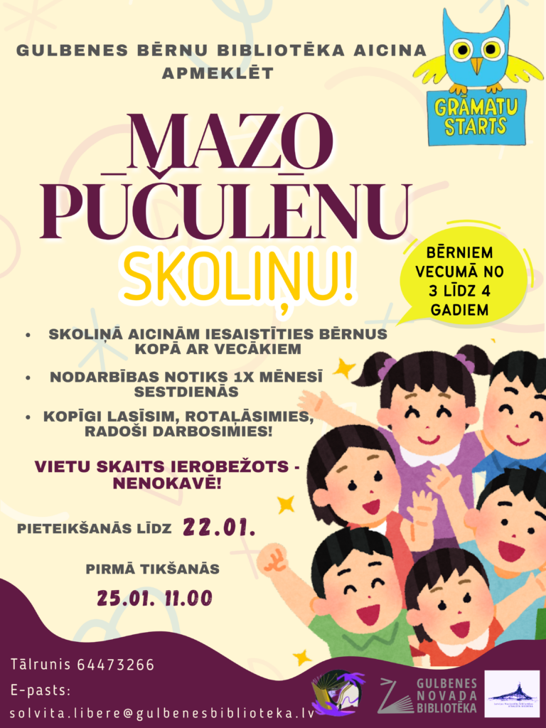 Gulbenes bērnu bibliotēka aicina uz Mazo Pūčulēnu skoliņu. Par to “Dzirksteli” informē Gulbenes bērnu bibliotēkas vadītāja Solvita Lībere.