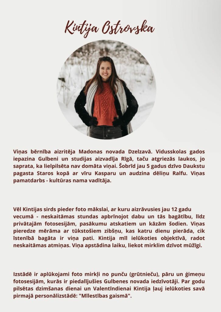 Līdz 28.februārim Gulbenes kultūras centrā – Kintijas Ostrovskas fotoizstāde “Mīlestības gaismā”. Izstādi var aplūkot darbdienās no 10.00 līdz 18.00, sestdienās – no 10.00 līdz 14.00.