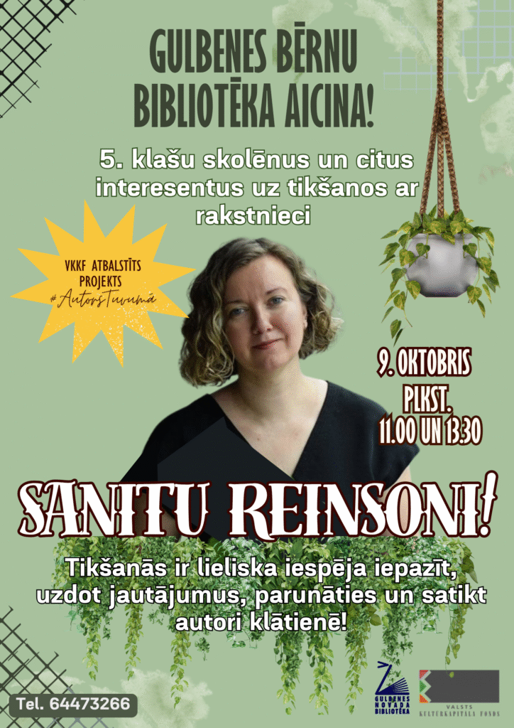 Tikšanās ar Sanitu Reinsoni notiks ceturtdien, 9. oktobrī, pulksten 11.00 un 13.30. Gulbenes novada bibliotēkas Bērnu apkalpošanas nodaļā. Tikšanās paredzēta 5. klases skolēniem, taču aicināts jebkurš interesents.