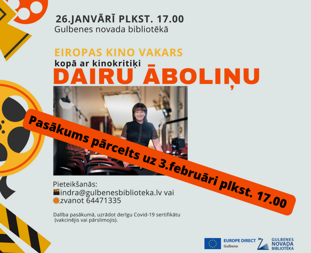 3.februārī pulksten 17.00 Gulbenes novada bibliotēkā būs Eiropas kino vakars kopā ar kinokritiķi Dairu Āboliņu.