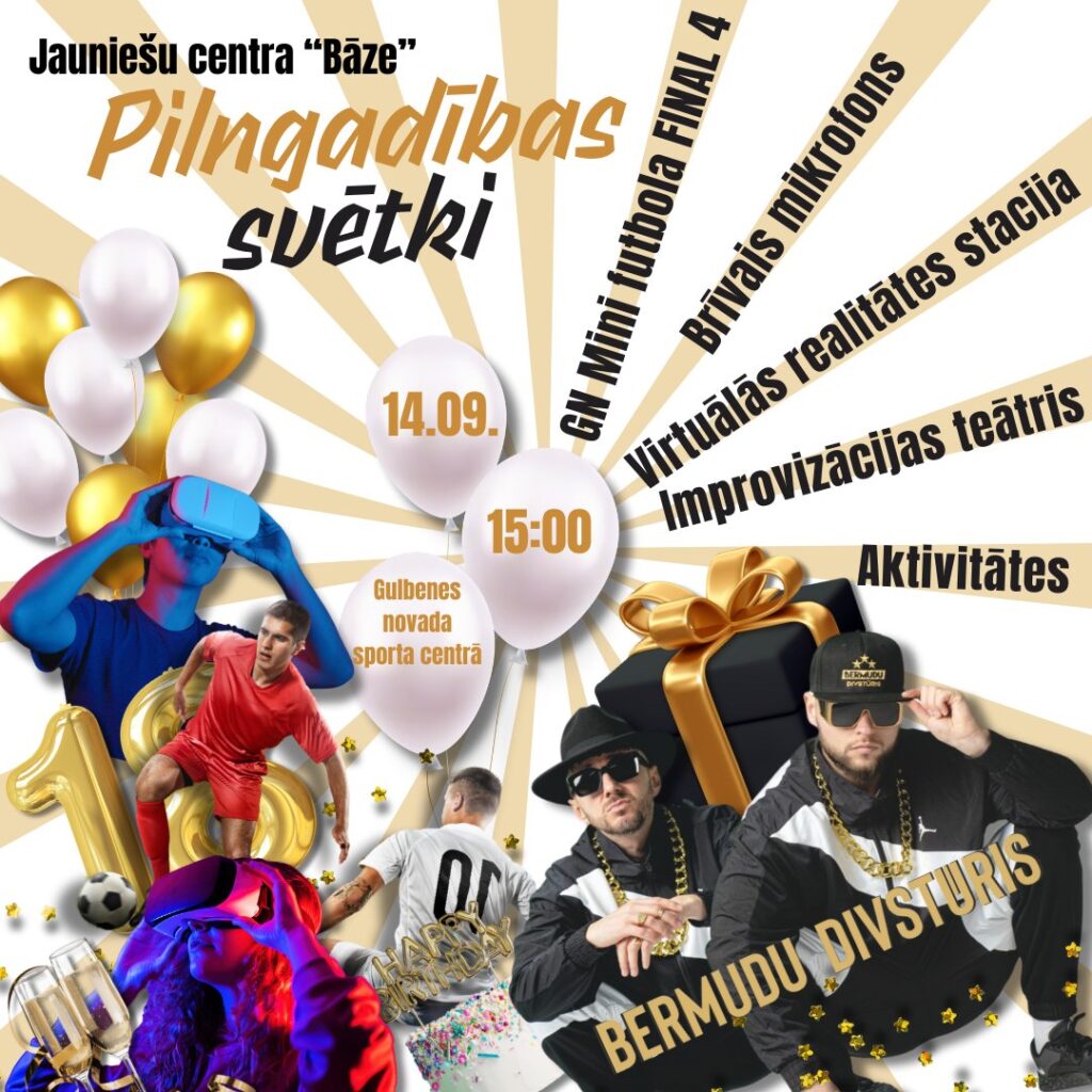 Gulbenes novada jauniešu centrs (JC) “Bāze” aicina pievienoties svinībām, mini festivālam “Jauniešu centra “Bāze” Pilngadības svētki”, kas notiks 14.septembrī plkst. 15:00 Gulbenes novada sporta centra pagalmā.