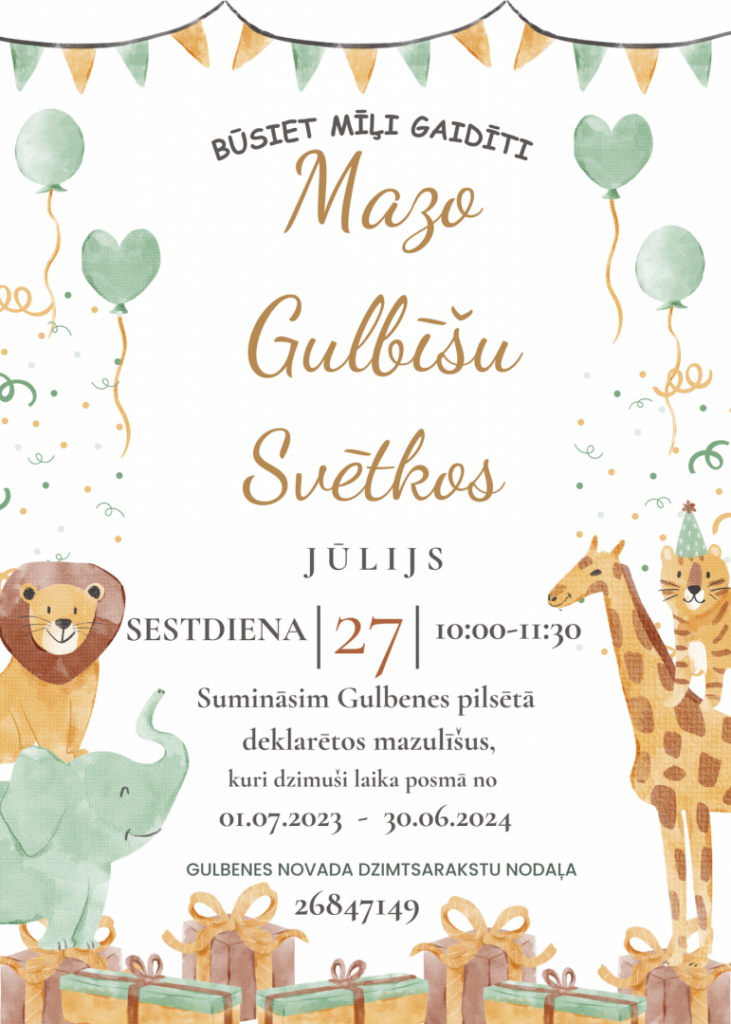 Gulbenes pilsētā deklarētie mazuļi (01.07.23-30.06.24.) Gulbenes novada saimē svinīgi tiks uzņemti Gulbenes pilsētas svētku laikā 27.jūlijā pulksten 10.00 Gulbenes novada jauniešu centra “Bāze” iekšpagalmā.