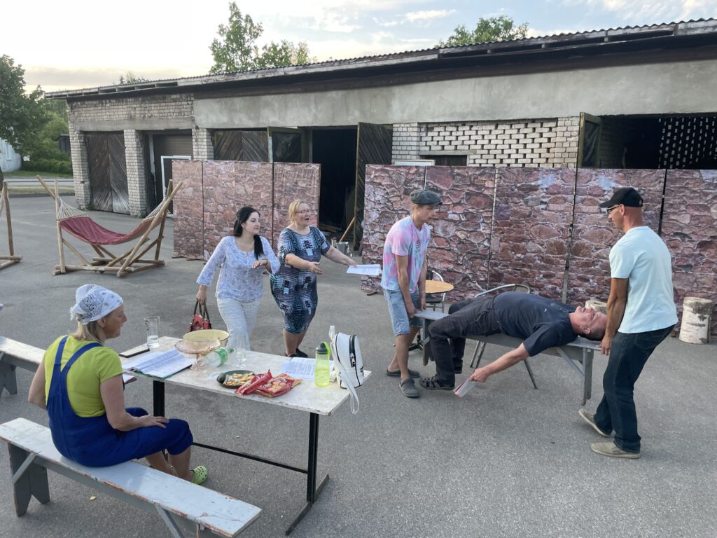 Mēģinājums omulīgā noskaņā. 14.jūnija vakarā “Dzirkstele” kļuva lieciniece Gulbenes Tautas teātra jauniestudējuma “Pilsētnieki” mēģinājumam pilsētas kultūras centra pagalmā. Bija labi laika apstākļi un visiem lielisks noskaņojums. Foto: Diāna Odumiņa.