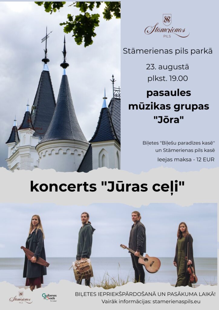 Pulksten 19.00 Stāmerienas pils parkā koncertu “Jūras ceļi” sniegs pasaules mūzikas grupa “Jõra”.