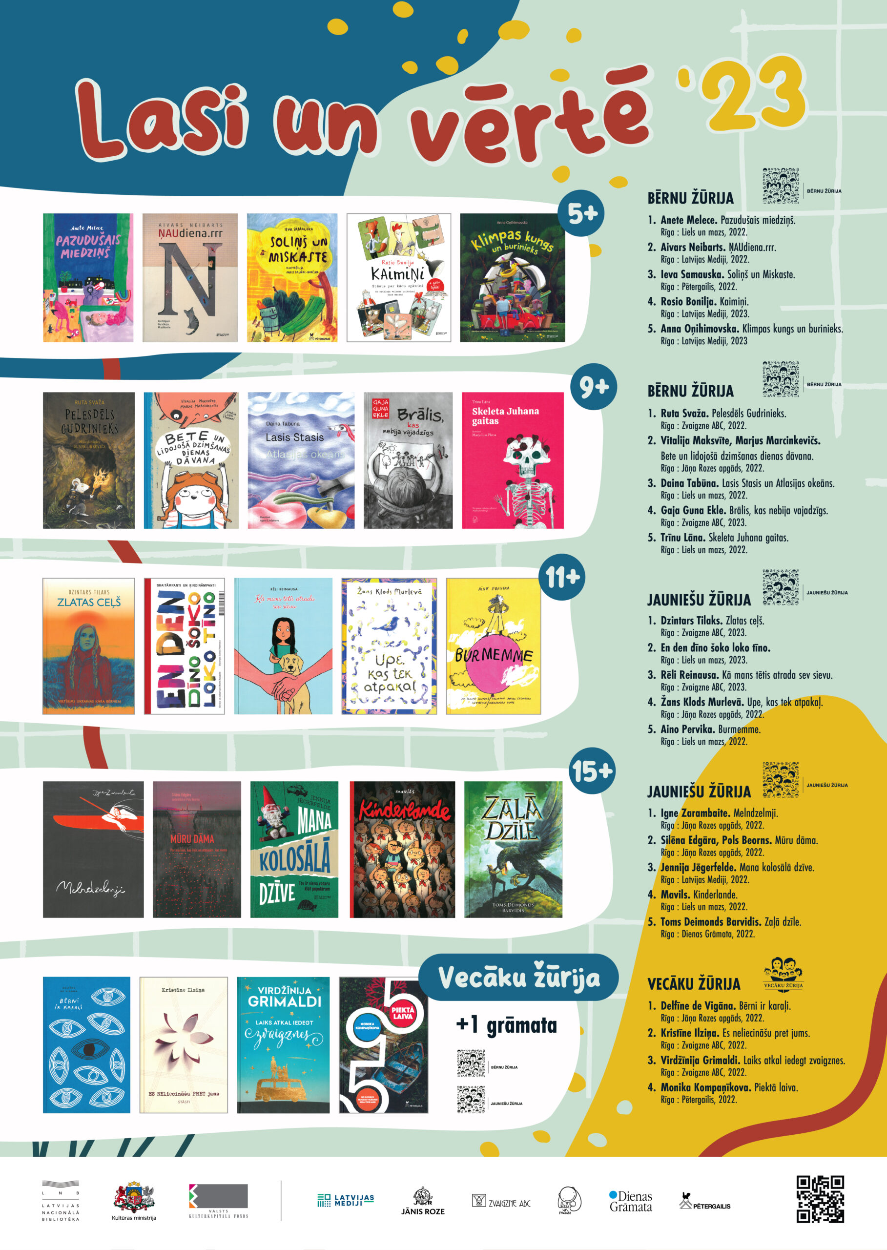 5+ grupā” ietverts Aivara Neibarta dzejoļu krājums “ŅAUdiena.rrr” (“Latvijas Mediji”) ar lieliskām Gundegas Muzikantes ilustrācijām. Anetes Meleces asprātīgā bilžu grāmata “Pazudušais miedziņš” (“Liels un mazs”) par grāmatu klātbūtnes nozīmi ģimenes ikdienā. Ievas Samauskas darbs “Soliņš un Miskaste” (“Pētergailis”), kurā stāstīts par dažādu lietu vērtību un nozīmi. No poļu valodas tulkotās Annas Oņihimovskas grāmatā “Klimpas kungs un burinieks” (“Latvijas Mediji”) tiek risināta mantu pārbagātības patiesā vērtība, bet no katalāņu valodas tulkotajā Rosio Bonilja grāmatā “Kaimiņi” (“Latvijas Mediji”) atklājas jautrs stāsts, kad pazūd internets, tas vēsta par saprašanos, draudzību un dažādiem talantiem.