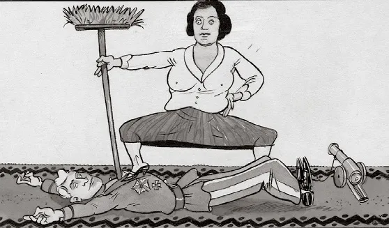 Žurnāliste un sabiedriskā darbiniece Berta Pīpiņa bija pirmā deputāte sieviete pēc deviņu gadu pārtraukuma. Saeimā 1931. gadā viņa iekļuva pēc savas partijas vadības apzināta lēmuma, nevis vēlētāju balsu dēļ. Karikatūrā atainota 4. Saeimā iekļuvušās Bertas Pīpiņas “uzvara” pār savu partijas biedru ģenerāli Eduardu Kalniņu, lai gan viņš vēlēšanās bija ieguvis vairāk balsu nekā Pīpiņa. Karikatūrists Aleksandrs Verners Bundža 1931. gadā ironizēja: “Ģenerāl, ģenerāl, nekaro ar sievieti! Tā tevi nožņaugs — ja ne citādi, tad ar zīda prievīti.”