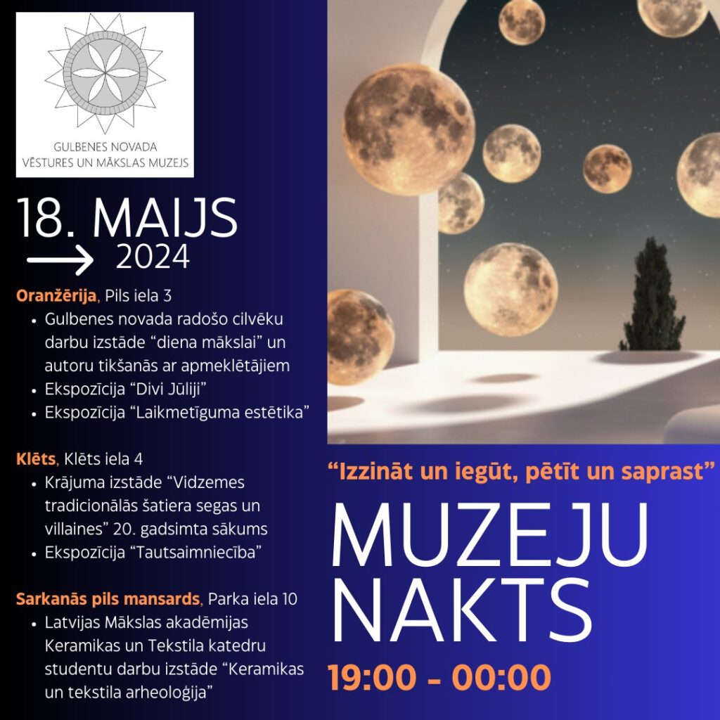 ● no 19.00 līdz 00.00: Oranžērijā – Gulbenes novada radošo cilvēku darbu izstāde “Diena mākslai” un autoru tikšanās ar apmeklētājiem, pastāvīgās ekspozīcijas “Divi Jūliji” un “Laikmetīguma estētika” (no 20.gadsimta sākuma līdz 1940. gadam);