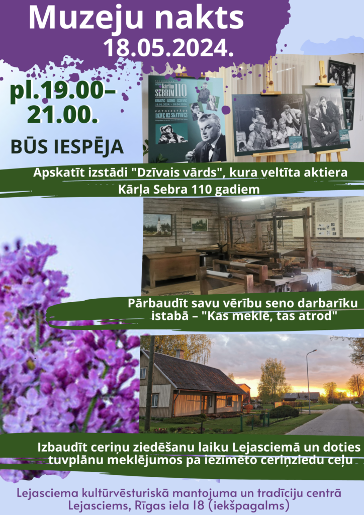 ● varēs aplūkot pastāvīgo ekspozīciju “Lejasciema senie darbarīki un sadzīves priekšmeti”, kurā ar interaktīva uzdevuma palīdzību varēs pārbaudīt savu vērību – “Kas meklē, tas atrod”;