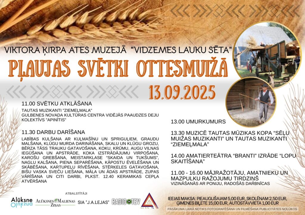 Sestdien, 13. septembrī, Alūksnes novadā uz tradicionālo rudens pasākumu “Pļaujas svētki Ottesmuižā” aicina Viktora Ķirpa Ates muzejs “Vidzemes lauku sēta”, kas šovasar svinēja 40 darbības gadu jubileju. Te ikviens varēs vērot un piedalīties senās Vidzemes lauku sētas rudens darbu darīšanā, baudīt muzikālus, dejas un teātra priekšnesumus un arī mājražotāju un amatnieku andeli.