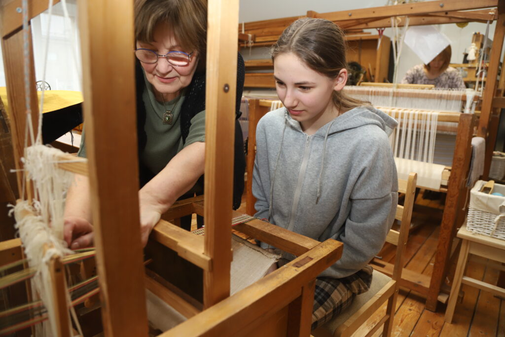 Gulbenes Tautas lietišķās mākslas studijas “Sagša” vadītājas Birutas Akmentiņas vadībā pie savas grāmatzīmes darināšanas ķērusies jaungulbeniete Viktorija Štokņa. Foto: Gatis Bogdanovs.