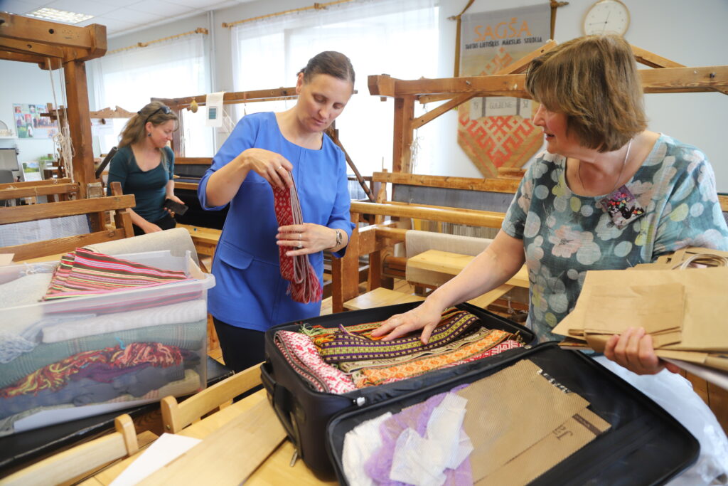 “Šis arī ir ļoti nopietns, godpilns pasākums, ar svētku sajūtu visas nedēļas garumā, kas saucas lietišķās mākslas gadatirgus. Tas Rīgā notiks vairākās vietās, bet mēs būsim Vērmanes dārzā. Tur būs mūsu darbi. Mēs stendu iekārtosim, prezentējot mūsu novadu. Arī gadatirgus organizētājiem, kad atsūtīja nolikumu, bija pieteikumu konkurss, kā sevi parādīs šajā pasākumā. Mēs zinājām, ka parādīsim savu novadu ar Jūlija Madernieka rakstiem. Tā kā mūsu studijas dalībnieču darbi ir izstādē un mēs tik ļoti daudz vēl nevarējām sastrādāt šajā laika periodā, esam uzaicinājuši radošo apvienību “Piektā māja”. Sadarbojoties savā stendā rādīsim Jūlija Madernieka rakstus, kas redzami uz krūzītēm. No mūsu pašu dalībnieču darbiem būs Lidijas Kazākas cimdi, ko viņa ada jau vairākus gadus, un viņa aizrāvusies ar Jūlija Madernieka rakstu ieadīšanu cimdos. Iet runa par dižošanos ne tikai gājienā, bet arī Vērmanes dārzā. Dižosimies ar Madernieka rakstiem, viņa mantojumu, to, kā mēs to uzturam, izmantojam. Mūsu cilvēki, kas ies gājienā, būs ļoti skaisti saģērbušies. Mēs savukārt turpināsim dižoties arī Vērmanes dārzā. Protams, būs arī visi citi tradicionālie audumi – dažādi dvieļi, vilnas lakati, galdauti, Laimdota Kliesmeta ar savu keramiku, kas arī ir tāda mūsu novada neatņemama sastāvdaļa. Atminoties iepriekšējos dziesmu svētkus, tad sajūtas Vērmanes dārzā ir tādas neaprakstāmas – tauta plūstoša, visi sirsnīgi, draudzīgi, smaidīgi. Šoreiz neviļus, bet pašiem patīkami ir sanācis, ka esam uzaicināti Rīgā piedalīties vēl vienā izstādē tieši ar rakstiem, ornamentiem,” stāsta B.Akmentiņa.