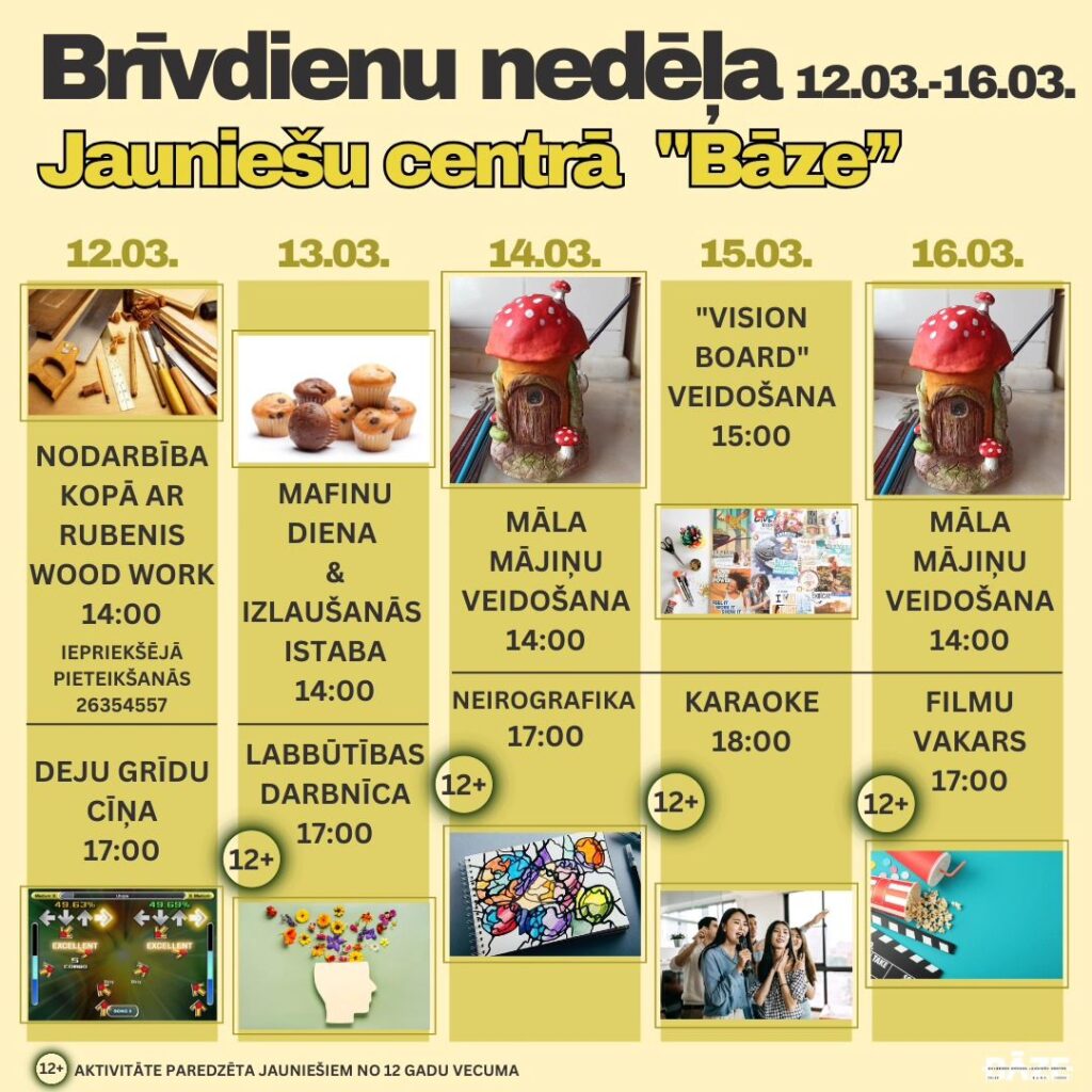 12.martā pulksten 14.00 “Bāzē” viesosies Arvis Rubenis, kurš darina dažādus izstrādājumus no koka. Pulksten 17.00 būs iespēja sacensties uz deju grīdas.