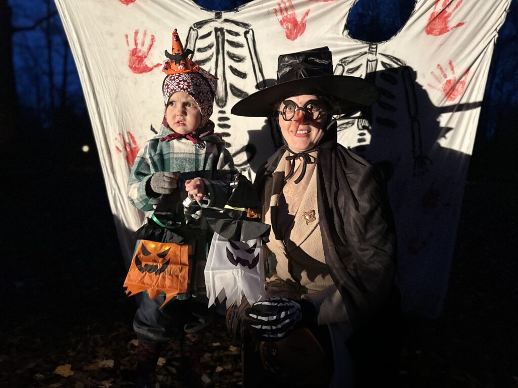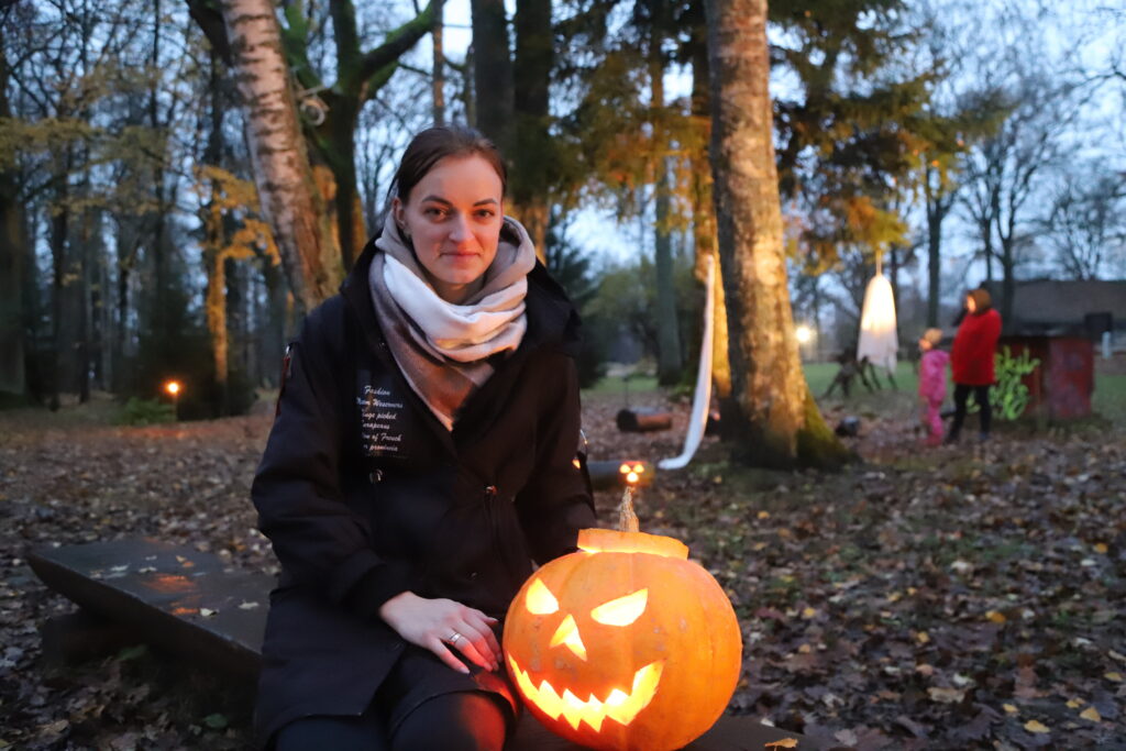 Mistisko un baiso sajūtu parkā “Dzirkstelei” izdevās satikt arī bijušo pagasta kultūras darba vadītāju Lieni Bodnieci, kura pašlaik atrodas bērna kopšanas atvaļinājumā. Viņa Halovīna ballīti parkā rīkoja pērn un šoreiz pasākumu apmeklēja ar meitiņu Līgu. Pati Liene bija tērpusies raganas tērpā, kurā bija piedomāts par vissīkākajām detaļām – pat zeķbikses viņas tērpā bija oranžas ar melniem ķirbīšiem un sikspārņu siluetiem!