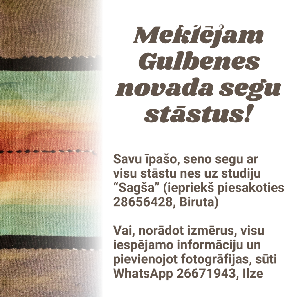 “Iespējams, daudziem no mums ir tā sega salocīta, padilusi, kožu caurumota nolikta bēniņos, tomēr īpaša, jo klusi stāsta par vecmāmiņas darbu pie stellēm, iemūžinot mūsu apvidum raksturīgās krāsas, līnijas un ornamentus. Apzinoties, ka katra nākamā diena var būt izšķiroša šo segu liktenim, Tautas lietišķās mākslas studija “Sagša” aicina Gulbenes novada iedzīvotājus dalīties ar saviem segu stāstiem un fiksēt vizuālās liecības. 2024.gada pavasarī studija plāno iesniegt projektu, kurā mūsu audējas uzsāks darbu pie apvidum raksturīgo seno segu atdzīvināšanas. Varbūt tieši tava īpašā sega iegūs jaunu elpu un nesīs savu stāstu nākotnē!” saka “Sagšas” pārstāve Ilze Vanaga.