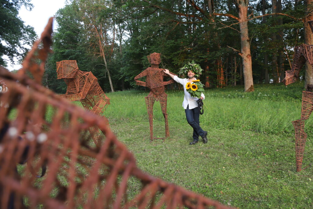 Figūras veidotas no dzelzs un kaņepju auklām, kas iemērktas speciālos sveķos un dzelzs pulverī, kas dabiski rūsēs. “Man bija žēl šķirties, bet šeit ir ļoti skaisti, izvēlējāmies vietu parkā, kur ir kā krustceles, “cīkstoņiem” prieks, ka atkal jauni skatītāji,” saka mākslinieks.