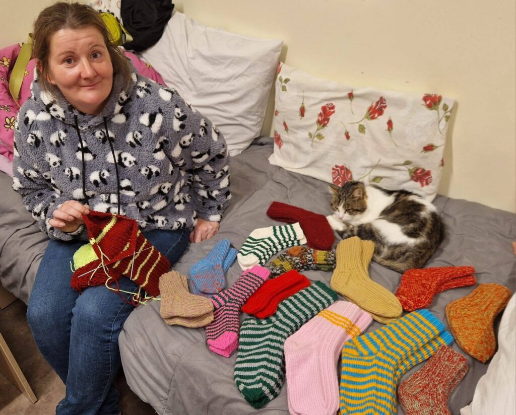 Tirzas grupu mājā “Doktorāts” pašlaik uzturas 10 klienti. Starp viņiem ir arī 44 gadus vecā Marina Otsa, kura ir aktīva zeķu adītāja un dara arī citas lietas.