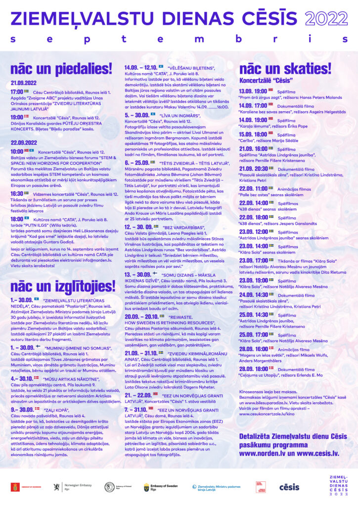 Ziemeļvalstu Ministru padomes birojs Latvijā cēsiniekiem piedāvās trīs ļoti atšķirīgas izstādes. Cēsu pilsētas Pastariņa sākumskolā bērni var iepazīties ar informatīvi ilustratīvu plakātu izstādi “ZIEMEĻVALSTU LITERATŪRAS NEDĒĻA”, kurā aplūkojami 27 plakāti un lasāmi Ziemeļvalstu autoru literāro darbu fragmenti. Koncertzālē “Cēsis” līdz 30 septembrim skatāma fotogrāfiju izstāde “LĪVA UN INGMĀRS”, kas veltīta pasaulslavenajam kino pārim — norvēģu aktrisei Līvai Ulmanei un zviedru režisoram Ingmāram Bergmanam. Kopumā izstādē apskatāmas 19 fotogrāfijas, kas ataino mākslinieku personiskās un profesionālas attiecības. Izstādē iekļauti kadri no filmām, filmēšanas laukuma un abu mākslinieku portreti. No 14.septembra līdz 12.oktobrim izstāde “VĒLĒŠANU BIĻETENS” būs skatāma kultūras namā “CATA”, kurā apkopoti vēlēšanu biļeteni no Baltijas jūras reģiona valstīm un arī citām pasaules daļām. Ziemeļvalstu un Baltijas reģionā ir 25 miljoni reģistrēto vēlētāju, bet tikai retais saprot, kāpēc vēlēšanu biļetens izskatās tāds, kāds tas ir. Izstādē būs apskatāmi vēlēšanu biļeteni no dažādām valstīm, tajā skaitā no Norvēģijas, Zviedrijas, Somijas un Lietuvas. Izstādes atklāšana notiks 14.septembrī plkst. 14:20, kad būs iespēja iepazīties ar ekspozīciju izstādes kuratora Maksa Valentīna vadībā.