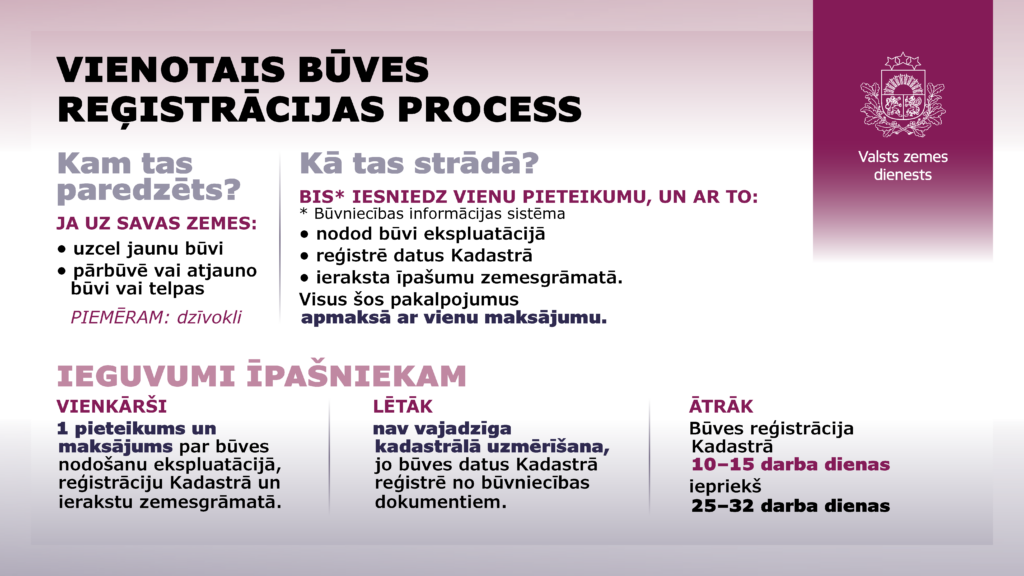 Saskaņā ar Valsts zemes dienesta aprēķiniem privātmājas reģistrācijas izmaksas turpmāk būs aptuveni divas reizes mazākas, savukārt lielu objektu gadījumā ietaupījums var sasniegt vairākus tūkstošus eiro. Vienotais process tiek piemērots gadījumos, ja zemes īpašnieks uz savas zemes būvē jaunu ēku vai inženierbūvi, kā arī pārbūvē vai atjauno esošu ēku, inženierbūvi vai telpu grupu, piemēram, dzīvokli. Šādos gadījumos zemes īpašnieks BIS iesniedz vienu iesniegumu, ar kuru vienlaikus tiek veikta būves nodošana ekspluatācijā, datu reģistrācija kadastrā un, ja nepieciešams, īpašumtiesību nostiprināšana zemesgrāmatā.
