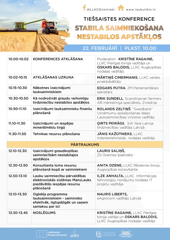 Konference tiešsaistē notiks 22.februārī no pulksten 10.00 LLKC Facebook kontā un www.laukutikls.lv. Konferences programma pielikumā.