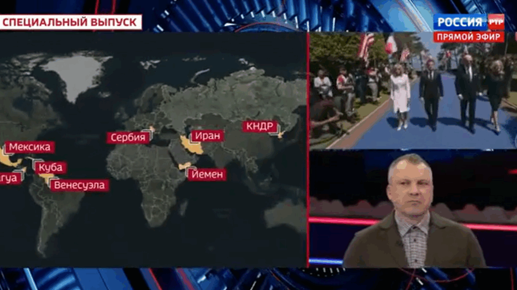 Raidījumā “60 minūtes” fonā nemitīgi tika demonstrēta karte, kurā bija atzīmētas šādas valstis: Meksika, Nikaragva, Kuba, Venecuēla, Serbija, Ziemeļkoreja, Irāna, Jemena. Kāpēc un kas šīs valstis vieno? Atbilde ir vienkārša – pēc propagandistu domām, tieši šīm valstīm Krievija varētu piegādāt tālas darbības raķetes, lai tās varētu dot triecienu pa Ameriku.