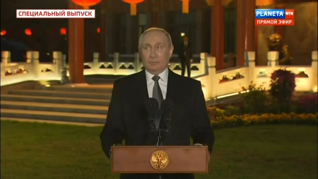 Kremļa televīzijas pārraidīja Putina vizīti Ķīnā Jaunā zīda ceļa projekta forumā, uzsverot, ka Krievijas prezidents Ķīnas forumā, kurā viņš teica arī savu uzrunu, esot sagaidīts ar ovācijām. Putins un Sji viens otru uzrunājot par “dārgo draugu”. Propagandisti arī līksmoja, ka Rietumi esot panikā par Ķīnas un Krievijas draudzību, jo tā nozīmējot jaunas multipolāras pasaules izveidi un apdraudot Rietumu neokoloniālismu un ASV hegemoniju. Ņemot vērā Krievijas agresiju Ukrainā un Ķīnas militāros draudus Taivānai, ciniski un liekulīgi izklausījās propagandistu apgalvojumi, ka tikai Ķīna un Krievija vēlas mieru visu pasaulē.