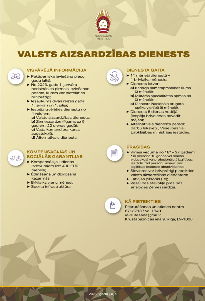 Aizsardzības ministrija informē, ka sākts darbs pie Valsts aizsardzības dienesta pakāpeniskas ieviešanas Latvijā, kas paredz piecu gadu laikā izveidot sistēmu, kurā visi 18 līdz 27 gadus veci Latvijas pilsoņi-vīrieši, bet sievietes šajā pašā vecuma grupā brīvprātīgi varēs izvēlēties vienu no četriem dienesta veidiem: Valsts aizsardzības dienestu, Zemessardzi, vada komandiera kursu augstskolā vai alternatīvo – Iekšlietu ministrijas, Veselības, Labklājības ministrijas – dienestu.
