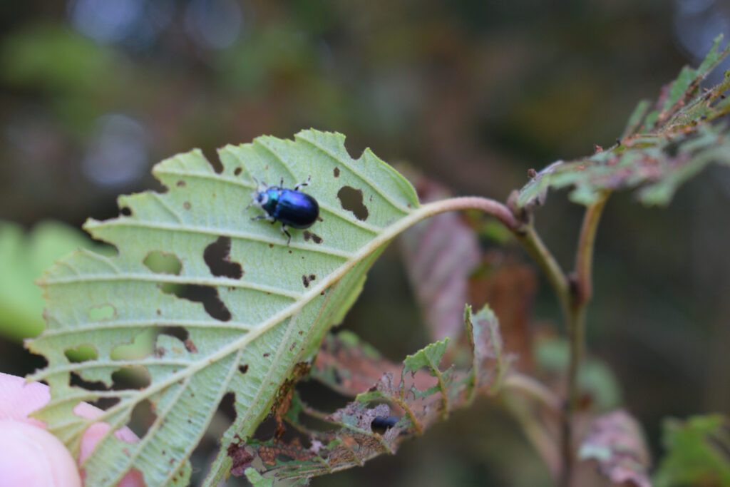 Latvijā ļoti bieži var novērot alkšņu zilo lapgrauzi (Agelastica alni), kurš vasarās masveidā ir sastopams uz alkšņu lapām. Tās ir tumši zilas, nelielas vaboles, kurām segspārni ir koši un ar metālisku spīdumu. Alkšņu zilais lapgrauzis pamatā barojas ar alkšņu lapām, bojā arī bērzu, apšu, ievu, ķiršu, ābeļu, plūmju, rožu un kārklu lapas, bieži vien apgrauž dzinumu mizu.