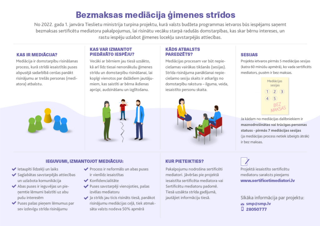 Sertificētu mediatoru padomes konsultatīvais tālrunis 28050777 (darba laiks darbdienās no plkst. 9.00 līdz 17.00), e-pasts: smp@smp.lv.