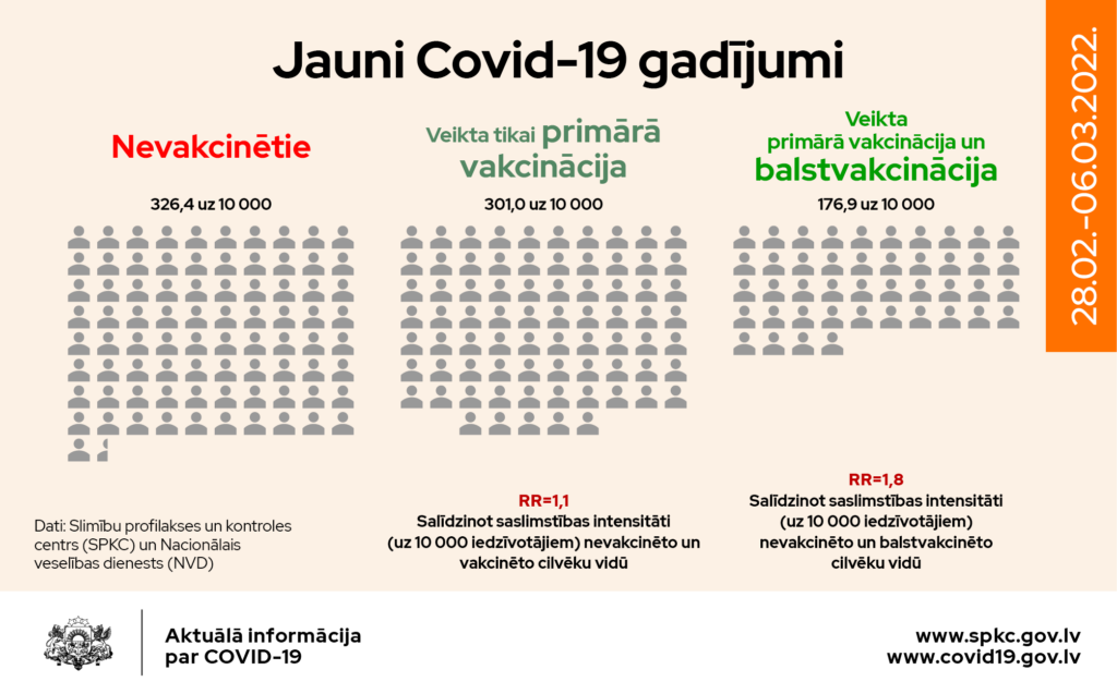 Februārī Latvijā cilvēkiem ar primāro vakcināciju un balstvakcināciju Covid-19 infekcija konstatēta 2,2 reizes retāk nekā nevakcinētajiem, salīdzinot saslimstības intensitāti uz 100 000 iedzīvotajiem.
