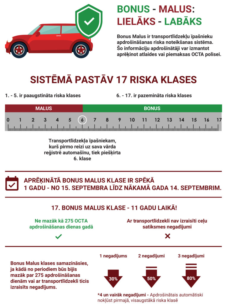 Saskaņā ar Latvijas Transportlīdzekļu apdrošinātāju biroja (LTAB) datiem pēc ikgadējās apdrošināšanas risku izvērtēšanas sistēmas Bonus–malus (BM) klašu pārrēķina, kas ik gadu notiek 15.septembrī, šogad BM klase palielinājusies 368 120, bet samazinājusies – 191 542 autoīpašniekiem. BM klase nav mainījusies 564 614 autoīpašniekiem. Par to informē LTAB sabiedrisko attiecību konsultants Gints Lazdiņš.