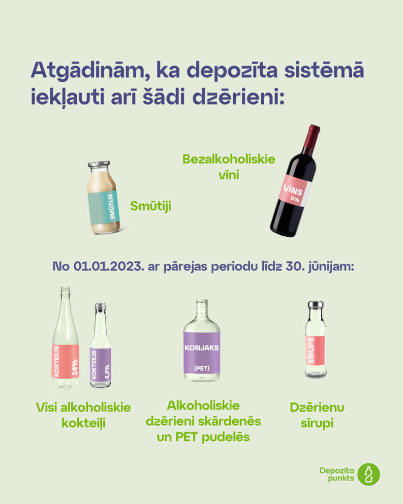 Jauns gads nācis ar jaunām pārmaiņām – ja sākotnēji depozīta sistēmā varēja nodot tikai daļu alkoholisko kokteiļu, tadno šī gada 1. janvāra iedzīvotāji var atgriezt visus alkoholiskos kokteiļus neatkarīgi no to alkohola satura. Tas nozīmē, ka nu depozīta punktos var atgriezt tādus pieprasītus produktus, kā, piemēram, dzērienus “Dins”, “Latvijas Balzams”, “Black Balsam”, “Cēsu Džons”, “Cido” grupas “Lode”, “Cēsu 14 %” un citus kokteiļus. Tāpat iespējams nodot arī visu veidu alkoholiskos dzērienus, kas iepildīti PET pudelēs un skārdenēs, piemēram, plastmasas pudelē iepildītu degvīnu, brendiju vai vīnu, skārdenē iepildītu vīna dzērienu vai citus līdzīgus dzērienus. Vēl viens jaunums no 1. janvāra ir arīiespēja nodot sīrupu pudeles, kas paredzētas dažādu dzērienu pagatavošanai, piemēram, ogu un augļu sīrupi. Ņemot vērā sīrupu konsistenci, pirms nodošanas depozīta punktos pudeli ieteicams izskalot.