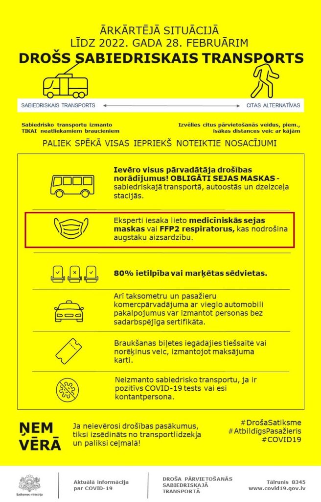 Ņemot vērā, ka aizvien uzrādās augsta Covid-19 saslimstības izplatība, Satiksmes ministrija aicina iedzīvotājus būt atbildīgiem un ievērot visus valstī noteiktos drošības pasākumus, sabiedrisko transportu izmantot tikai neatliekamiem braucieniem. Tāpat, ja ir iespēja, īsās distances veikt kājām vai velosipēdu, biļetes iegādāties tiešsaistē vai ar maksājuma kartēm. Katra cilvēka izlēmīga rīcība, rūpīgi ievērojot visus drošības pasākumus un vakcinējoties, palīdz ierobežot Covid-19 izplatību un atgriezties ierastajā ikdienas dzīves ritmā.
