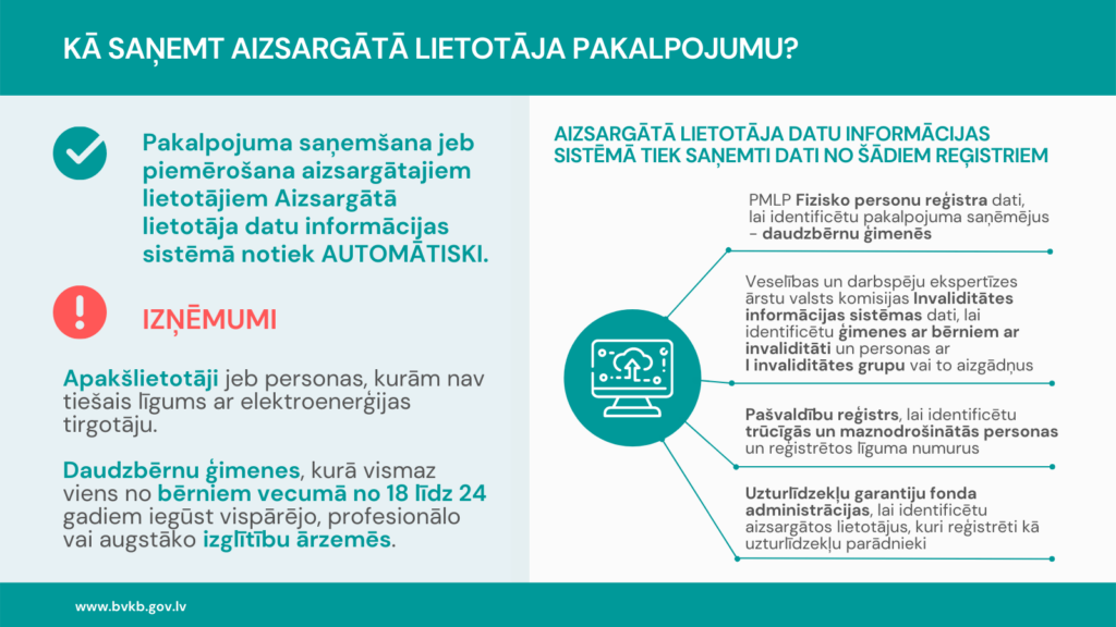 Citus interesējošos jautājumus par aizsargāto lietotāju var atrast BVKB tīmekļvietnē vai zvanot uz vienu no minētājiem numuriem (+371 68206992; +371 67013312; +371 67013369; +371 67013375).