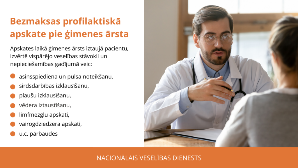 Iedzīvotājus, kuri pēdējo trīs gadu laikā nav vērsušies pie sava ģimenes ārsta saistībā ar kādu saslimšanu vai sūdzību par veselību, aicina veikt valsts apmaksātu profilaktisko apskati. Lai līdz gada beigām prakses varētu organizēt savu darbu un individuāli uzrunāt šos pacientus ierasties uz apskati, ģimenes ārstu praksēm novirzīti 5,5 miljoni eiro, informē Nacionālais veselības dienests (NVD). Šos līdzekļus varēs izmantot atbilstoši konkrētas prakses vajadzībām. Piemēram, prakses nodarbināto papildu darba laika apmaksai, papildu darbinieku piesaistei, nepieciešamo informācijas tehnoloģiju vai rīku iegādei u.c.