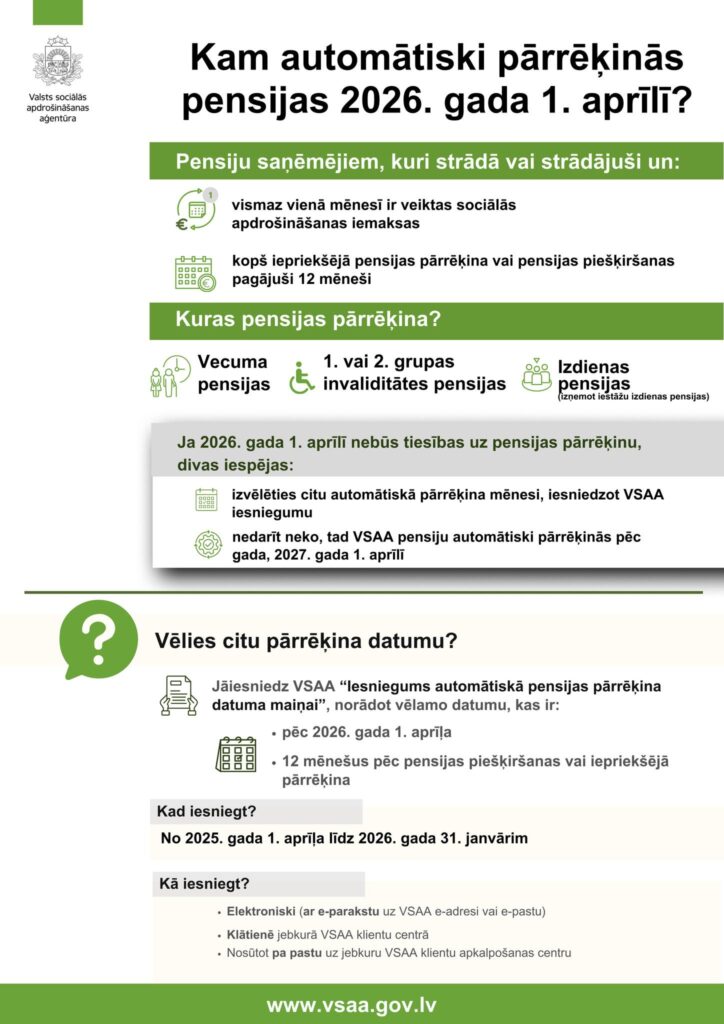 Strādājošie pensiju saņēmēji drīkst izvēlēties citu pārrēķina mēnesi, laika periodā no 2025. gada 1. aprīļa līdz 2026. gada 31. janvārim iesniedzot VSAA iesniegumu par automātiskā pensijas pārrēķina mēneša maiņu. Tādā gadījumā pēc 2026. gada 1. aprīļa un turpmākos gadus VSAA pensiju automātiski pārrēķinās no personas izvēlētā mēneša pirmā datuma. Šādu kārtību paredz grozījumi likumā „Par valsts pensijām”.