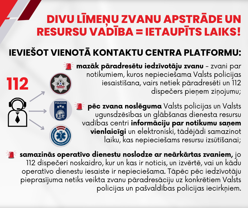 “Notiekot negadījumam, svarīgi ir pēc iespējas ātrāk sniegt atbilstošu palīdzību, tāpēc pēc vairāku gadu darba ir noslēdzies apjomīgs projekts, kurš ļaus samazināt laiku, kādā operatīvie dienesti dodas palīgā nelaimē nokļuvušiem. Lai to sasniegtu, ārkārtas ziņojumu saņemšana un apstrāde turpmāk notiks divos līmeņos,” uzsver Valsts ugunsdzēsības un glābšanas dienesta (VUGD) priekšnieks M.Baltmanis. Pirmajā līmenī – 112 Kontaktu centrā ienāk un tiek apstrādāti visi iedzīvotāju ziņojumi – zvani, eZvani, īsziņas par negadījumiem un notiek šo ziņojumu izvērtēšana, kuras rezultātā tikai ārkārtas zvani tiek novirzīti attiecīgajiem operatīvajiem dienestiem. Otrajā līmenī elektroniski un vienlaicīgi informāciju par negadījumu saņem Valsts ugunsdzēsības un glābšanas dienesta un Valsts policijas resursu vadības centri, kas uz notikuma vietu nosūta nepieciešamos operatīvā dienesta resursus. “Ja iepriekš liela daļa uz tālruņa numuru 112 saņemto zvanu tika pāradresēti, bet informācija par izsaukumiem citiem operatīvajiem dienestiem nodota telefoniski, tad pēc projekta īstenošanas zvanu pāradresācija un telefoniska informācijas nodošana notiek tikai Neatliekamās medicīniskās palīdzības dienestam,” papildina M.Baltmanis.