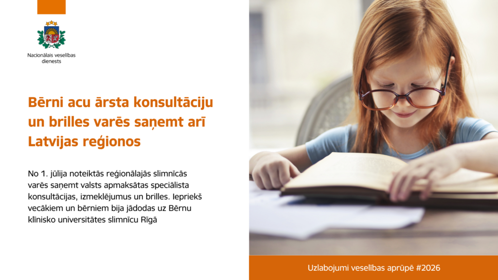 Vēl viens būtisks jaunums — lai uzlabotu briļļu pieejamību bērniem reģionos, noteiktās reģionālajās slimnīcās varēs saņemt valsts apmaksātas speciālista konsultācijas izmeklējumus un arī brilles. Iepriekš ar šo mērķi vecākiem un bērniem bija jādodas uz Rīgu, Bērnu klīnisko universitātes slimnīcu.