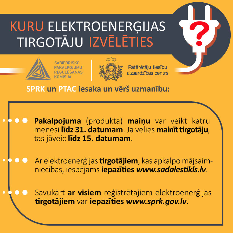 • Pakalpojuma (produkta) maiņu pie esošā tirgotāja var veikt katru mēnesi līdz 31.datumam, savukārt tirgotāju maiņu – līdz 15.datumam. Ar elektroenerģijas tirgotājiem, kas apkalpo mājsaimniecības, iespējams iepazīties AS “Sadales tīkls” tīmekļvietnē (https://ej.uz/ST_tirgotaji). Bet ar visiem reģistrētajiem elektroenerģijas tirgotājiem (arī tiem, kas apkalpo tikai juridiskas personas vai aktīvu darbību vēl nav izvērsuši) var iepazīties SPRK tīmekļvietnē (https://ieej.lv/registrs).