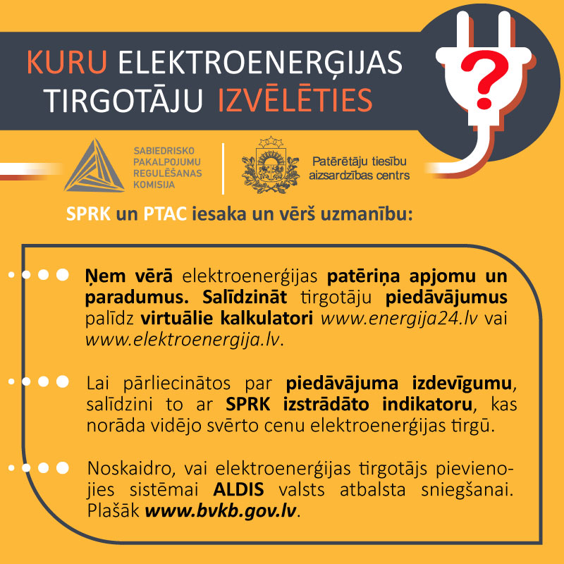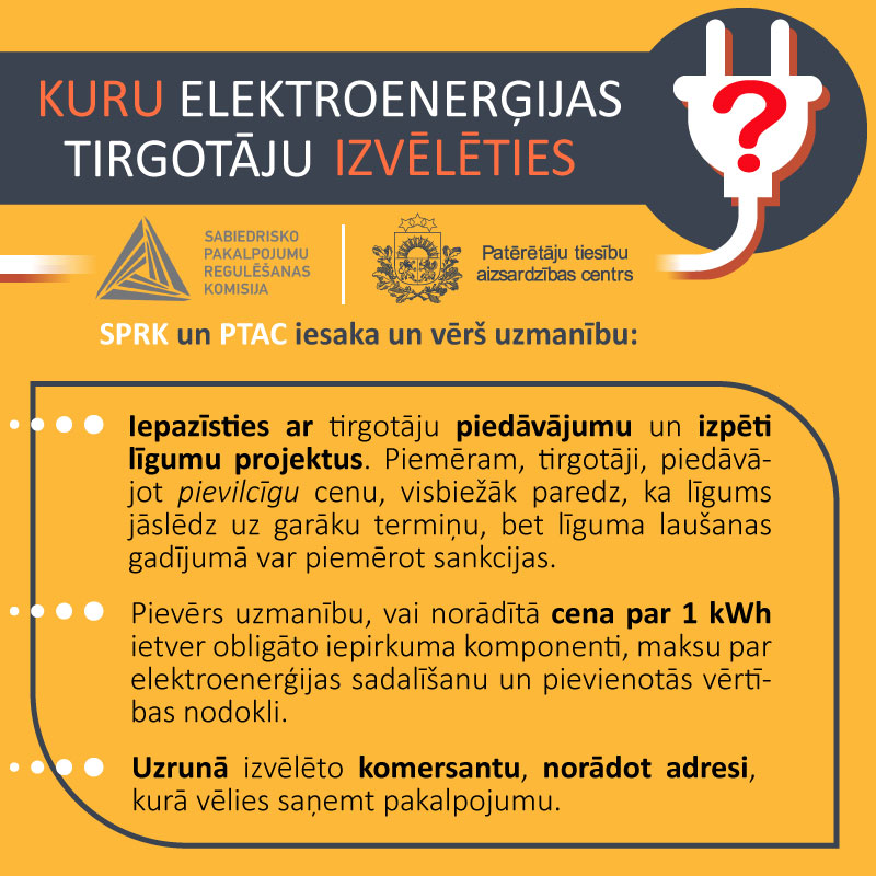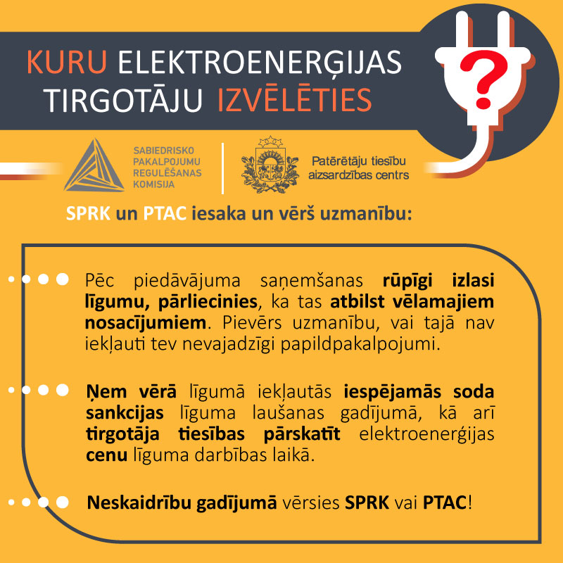 Pirms elektroenerģijas tirgotāja izvēles SPRK un PTAC iesaka un vērš uzmanību: