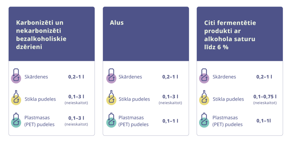 No 01.02.2022. depozīta sistēmā varēs nodot stikla, plastmasas (PET) un metāla (skārdenes) dzērienu iepakojumus. Šajos iepakojumos var būt iepildīti dažādi karbonizētie un nekarbonizētie bezalkoholiskie dzērieni (piemēram, minerālūdens, dzeramais ūdens, limonādes, enerģijas dzērieni, ledus tēja, sulas, nektāri), visa veida alus, kā arī citi fermentētie produkti ar alkohola saturu līdz 6 % (piemēram, sidrs, alkoholiskie kokteiļi ar alkohola saturu no 0,5 % līdz 6 %). Svarīgi piebilst, ka depozīta sistēmā nevarēs nodot vīna un stiprā alkohola pudeles.