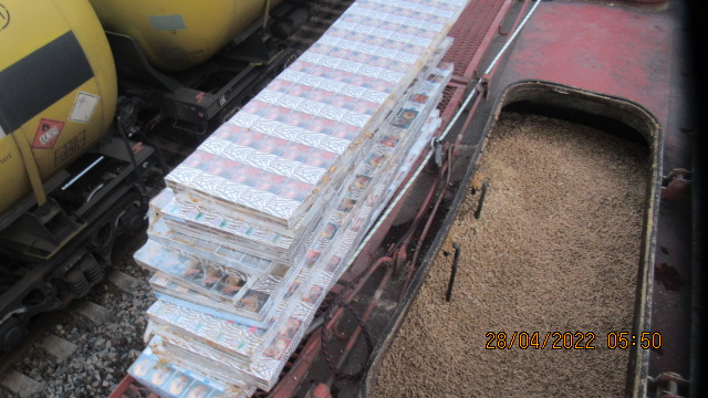 28.aprīlī Indras MKP, veicot vilciena sastāva skenēto attēlu analīzi, muitas amatpersonai radās aizdomas par nedeklarētu preču pārvietošanu vagonā ar kokskaidu granulu kravu. Veicot muitas fizisko kontroli, konstatētas no muitas kontroles paslēptas cigaretes “NZ” un “Minsk”. Izņemtas 89 600 cigaretes jeb 4480 paciņas cigarešu.